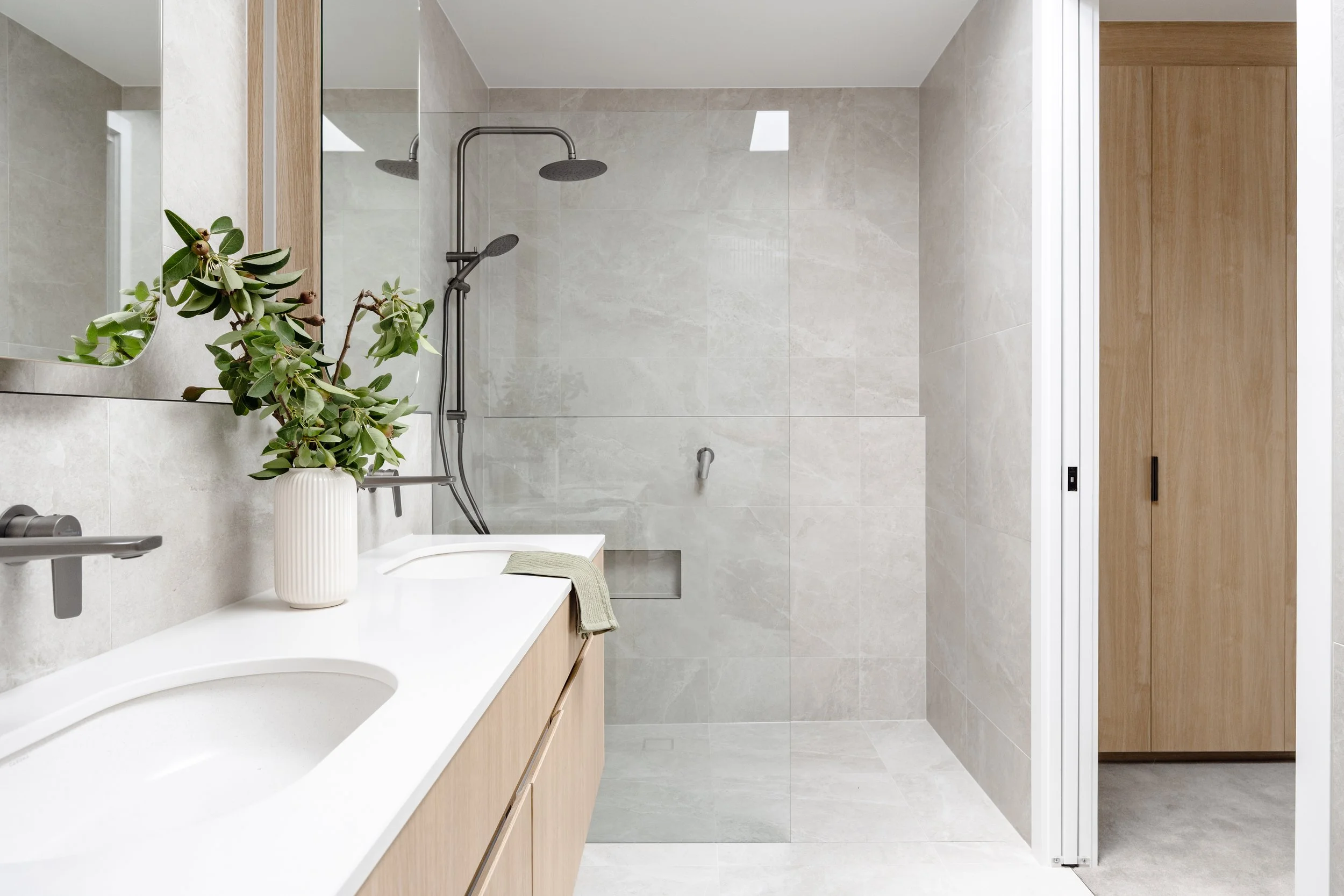 A contemporary Australian home defined by clean lines, natural textures and calming, light-filled spaces. Soft timber cabinetry, gentle blue accents and refined detailing bring a sense of warmth and understated luxury throughout. From the sculptural entryway to the serene master suite and beautifully crafted kitchen, every space has been considered for modern, effortless living.